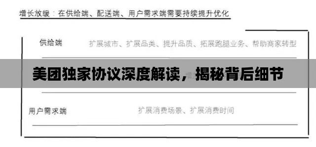 随着互联网的快速发展,各大平台间的竞争也日益激烈,在众多领域中,美团凭借其卓越的服务和创新能力脱颖而出,而美团独家协议内容,作为美团业务合作的核心部分,引起了广泛关注,本文将详细解析美团独家协议的主要内容,探讨其合作双方的权利与义务,及其对业务发展的影响。