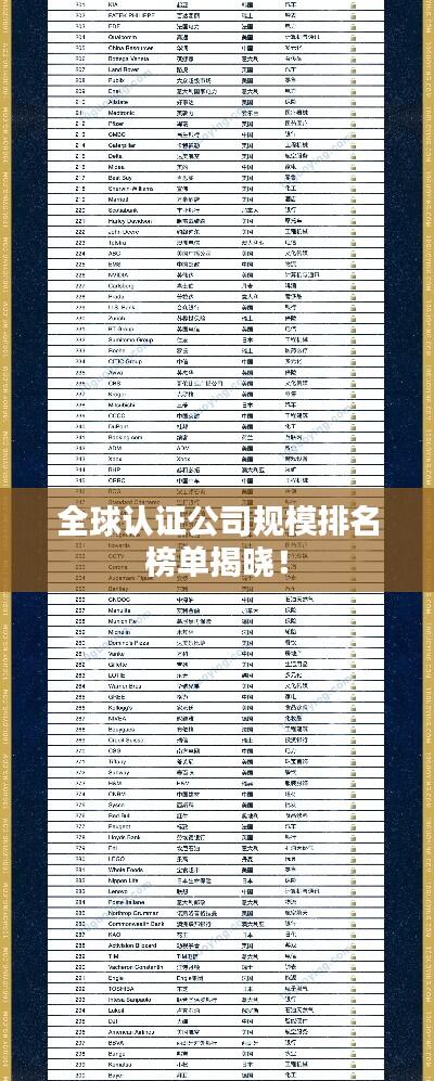 随着全球经济的不断发展和商业活动的日益频繁,认证公司在各行各业中扮演着越来越重要的角色,这些公司通过提供专业的评估、审核和认证服务,为企业的发展提供了有力的支持,在全球认证行业中,哪些公司规模较大,排名靠前呢?本文将为您揭示世界认证公司规模排名。