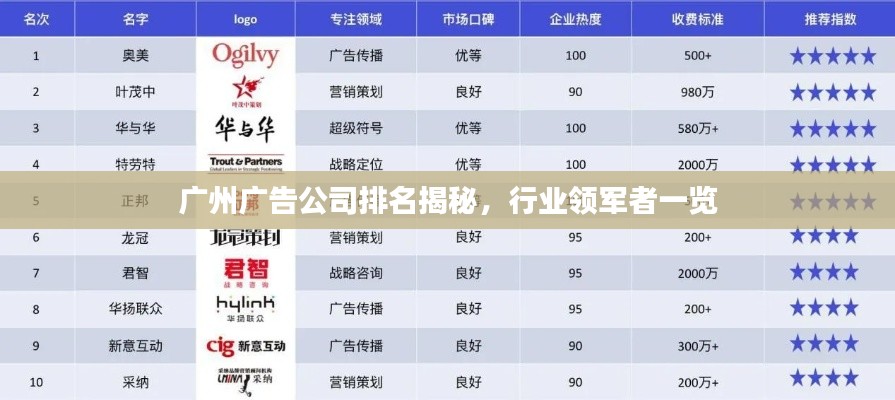 广州,作为中国的经济中心之一,广告业亦发展迅猛,众多广告公司如雨后春笋般涌现,本文将为您梳理广州广告公司的排名,带您了解行业领军者。