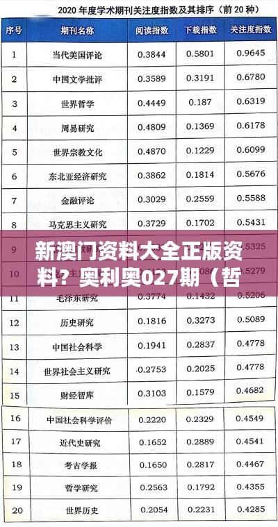 《新澳门资料大全正版资料?奥利奥027期(哲学社会科学文献中心)》以其权威性和实用性著称。所收录的文献均经过严格的筛选和认证,确保了信息的准确性和可靠性。同时,该大全还提供了便捷的检索工具和详细的文献导读,使得用户可以轻松地找到所需资料,极大地提高了文献的实用性。